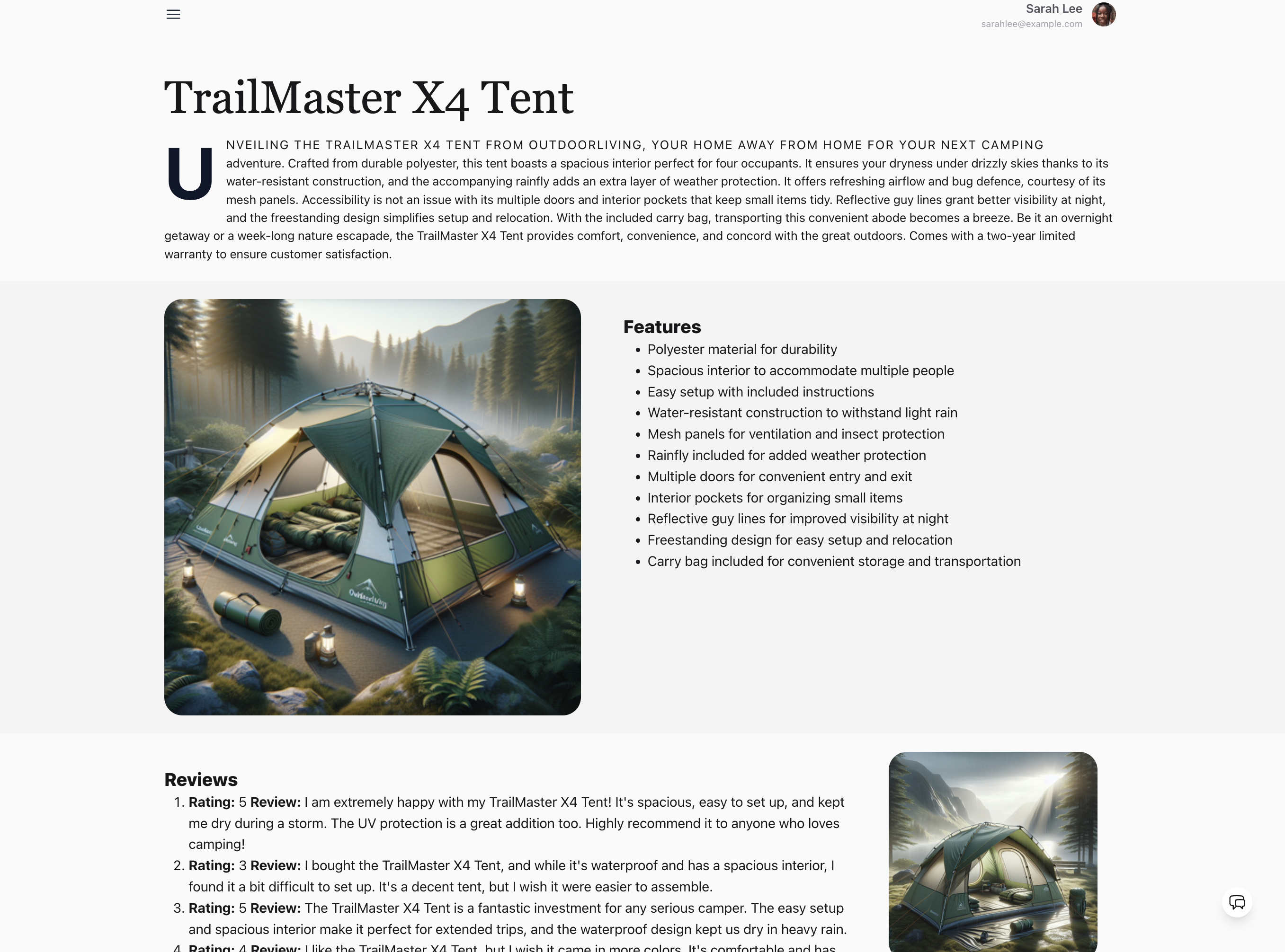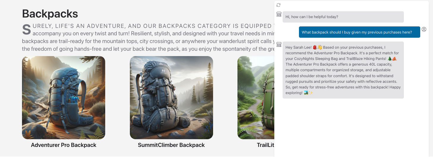 The previous step gives us a basic flow that augments predefined model behaviors to add product context. Now, we want to add another tool (or processing function) that looks up customer details for additional prompt engineering. The end result should be a user experience that looks something like this, helping move the user closer to a purchase decision.