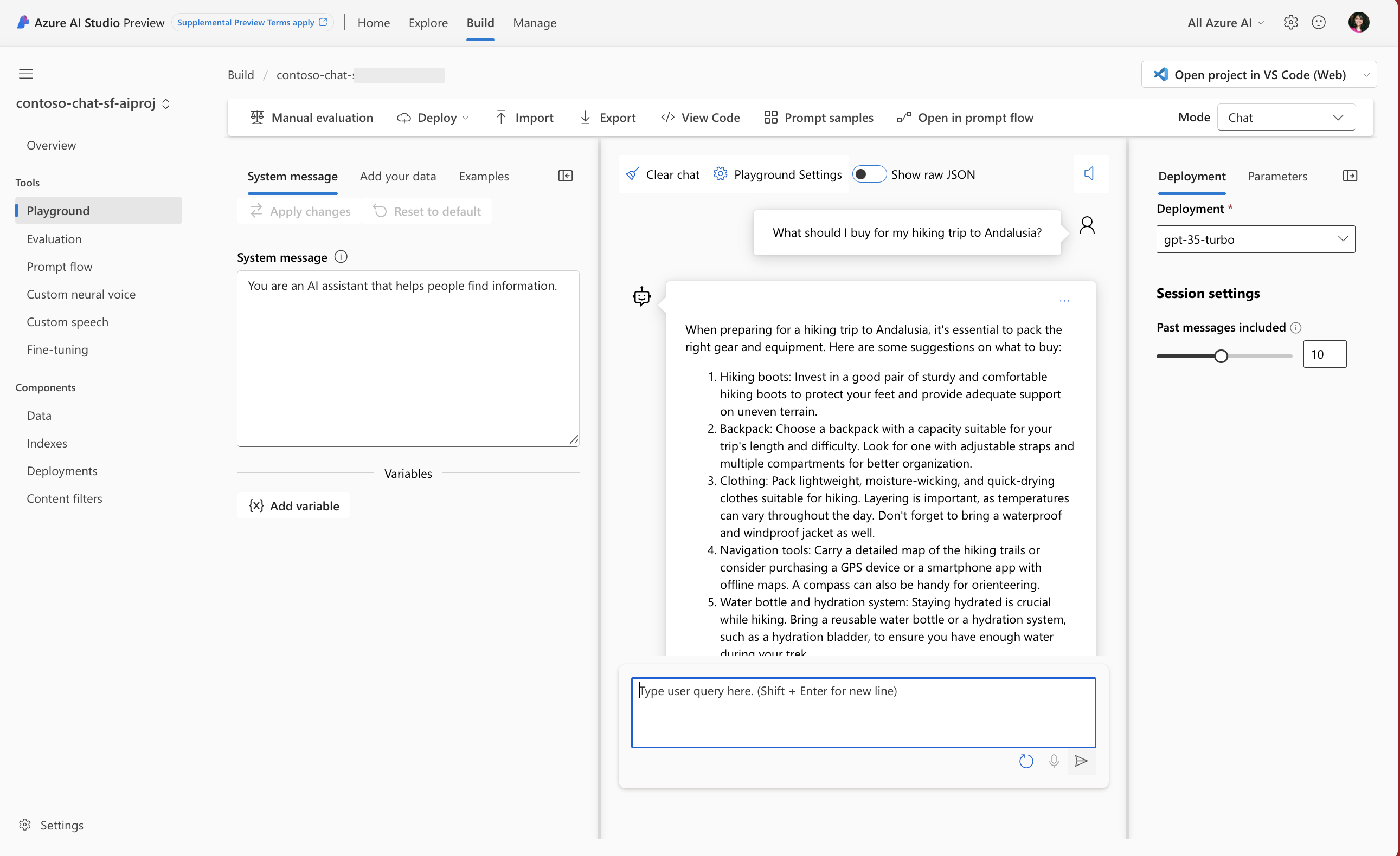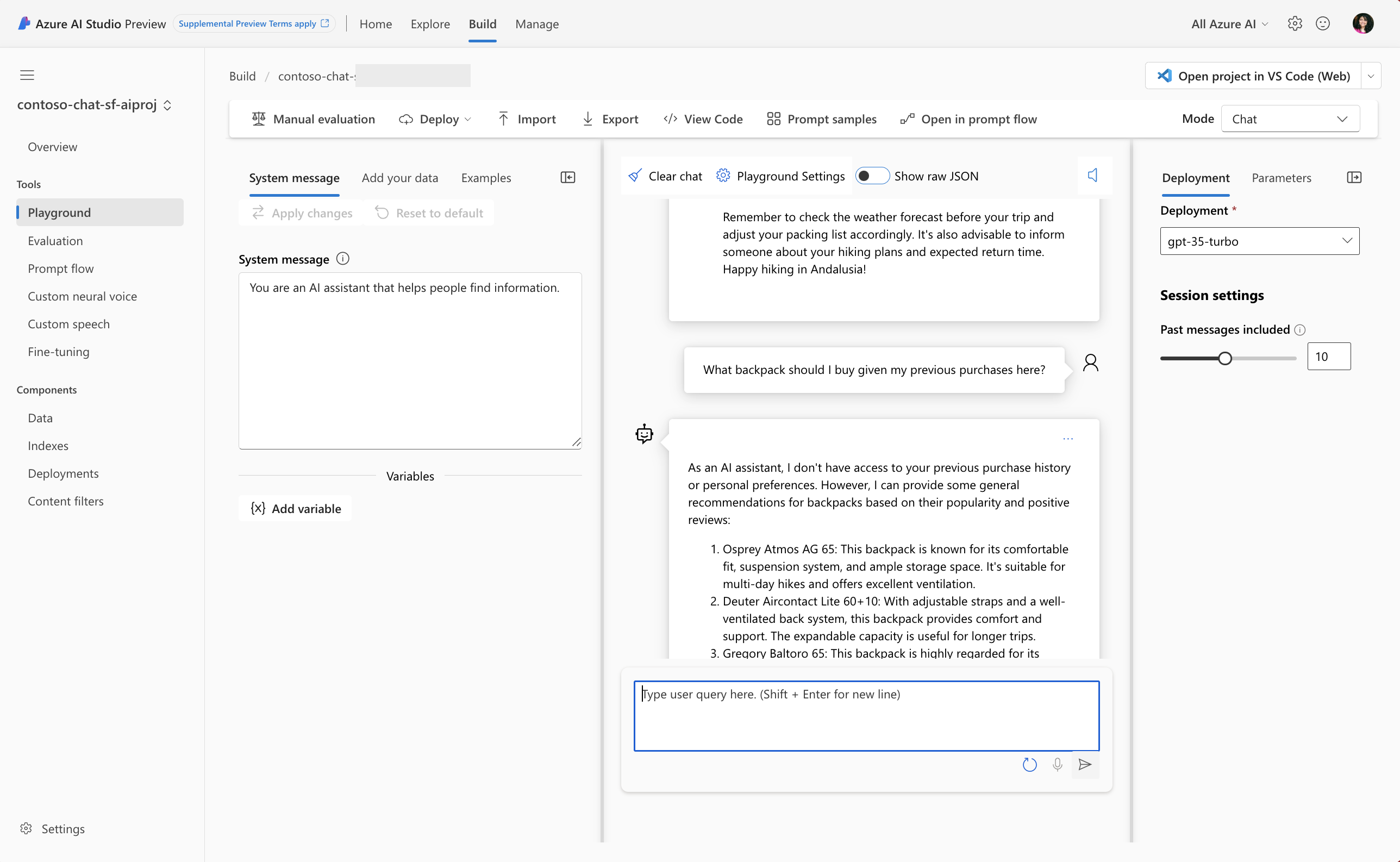 We know that Azure OpenAI provides a number of pre-trained models for chat completion so let's see how the baseline model works for our requirements, by using the Azure AI Studio Playground capability with a gpt-3.5-turbo model deployment. This model can understand inputs (and generate responses) using natural language.